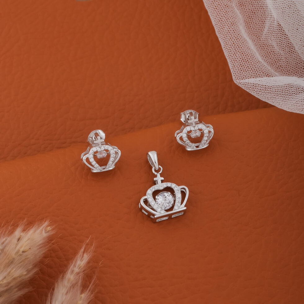 A silver crown pendant set is a stylish and symbolic jewelry ensemble that typically includes a crown-shaped pendant paired with matching earrings, all crafted in radiant silver. This set stands out for its regal appearance and meaningful representation of power, confidence, and elegance.